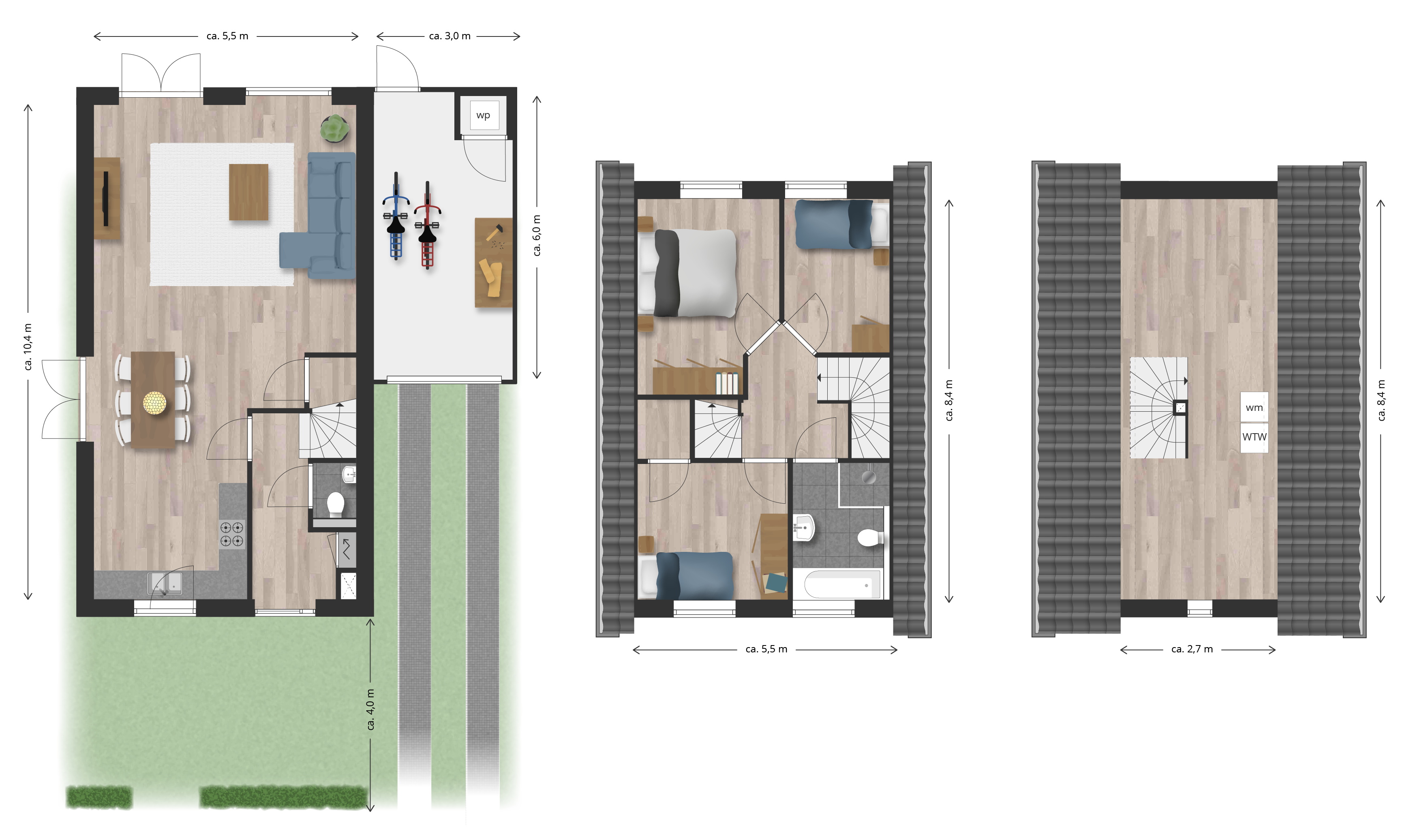 Het type ‘Blenda – Nul op de Meter’ is een doorontwikkelde vrijstaande woning met riante maatvoering. Met maar liefst 24 PV-panelen, een luchtwater-warmtepomp en triple-beglazing mag dit woningtype zich ‘nul-op-meter’ noemen. Dit betekent dat aan het einde van het jaar de woning net zo veel energie heeft opgewekt als dat de installatie van de woning en de apparatuur van de bewoner heeft verbruikt. Type ‘Blenda – Nul op de Meter’ is behalve energiezuinig ook onderhoudsvriendelijk. De kozijnen in de buitengevel zijn allemaal uitgevoerd in kunststof. Ook is geen houtwerk toegepast in bijvoorbeeld de dakgoten en boeidelen. De woning heeft aan de buitenzijde dus geen schilderwerk! De woning wordt standaard gebouwd met achteruitbouw en heeft zo een afmeting van maar liefst 6,2 meter breed en 11,1 meter diep. Op de begane grond is de woning voorzien van een ruime woonkamer/keuken, een bergtrapkast en een entree met toiletruimte. Op de eerste verdieping bevinden zich drie ruimte slaapkamers en een badkamer met een tweede toilet. Optioneel kan er gekozen worden om een ligbad te plaatsen. De tweede verdieping is te bereiken met een vaste trap. Hier bevindt zich de technische installatie. Daarnaast biedt de tweede verdieping veel ruimte waar optioneel twee extra slaapkamers gerealiseerd kunnen worden. De woning is standaard ook voorzien van een aangebouwde berging met ruim 17m2 gebruiksoppervlakteKenmerken Blenda – Nul op de meter