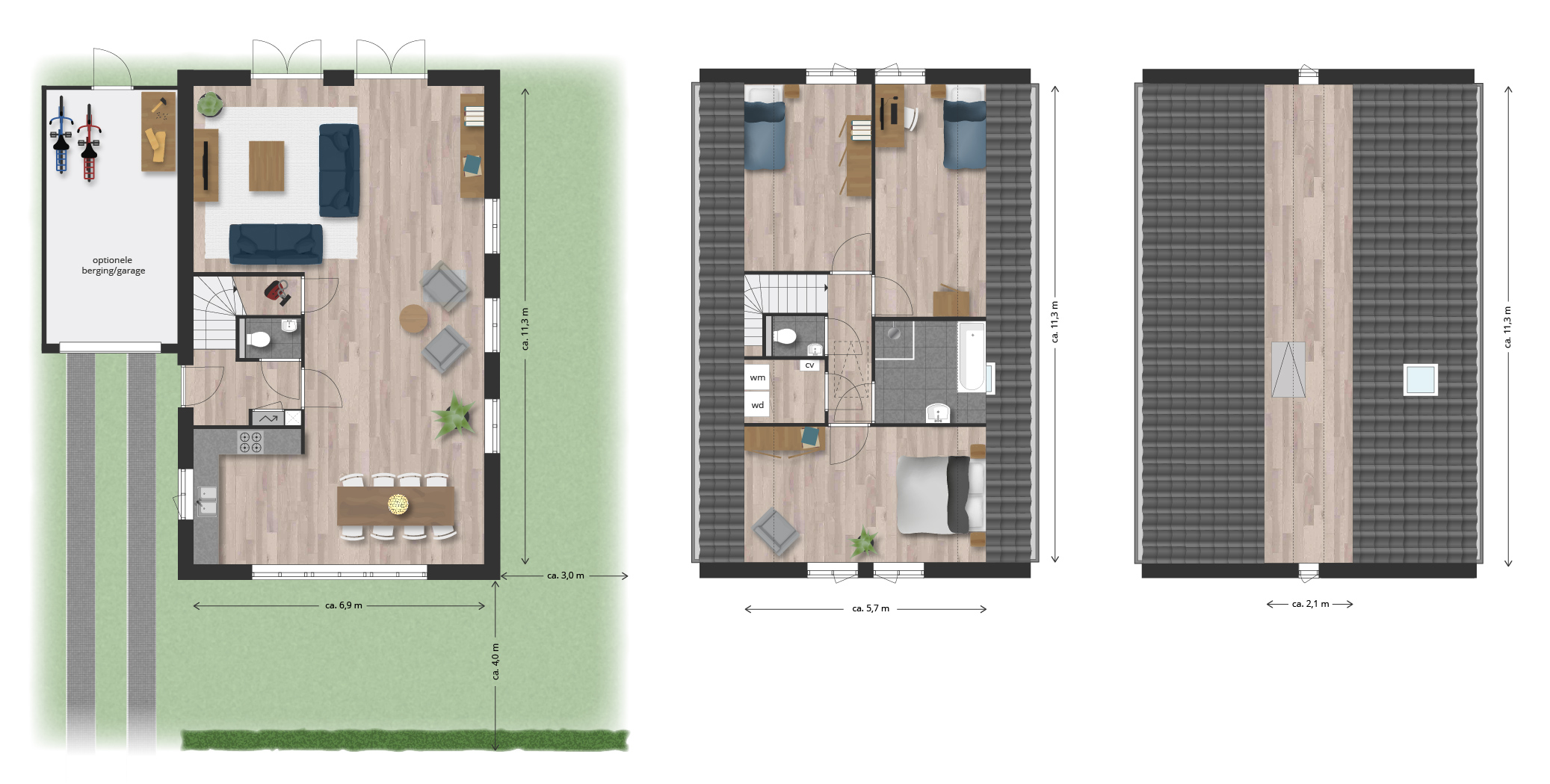 Type Lutea heeft een unieke platte voorgevel. Op de begane grond verrijkt een erker met een riante raampartij de voorgevel. Via de ruime hal met toilet en meterkast komt u in de woonkamer terecht. De tuin is bereikbaar via de dubbele openslaande tuindeuren. De keukenopstelling kan naar wens tuingericht of straatgericht worden geplaatst. Op de eerste verdieping bevinden zich 3 grote slaapkamers en de badkamer. Via de overloop is een aparte ruimte bereikbaar voor wasmachine en droger. Tegenover de ruime badkamer wordt op de verdieping een separaat toilet gerealiseerd. De zolderverdieping is strandaard via een vlizotrap te bereiken. Via een optionele vaste trap kunnen op de zolder twee extra kamers worden gerealiseerd. De woning is optioneel te voorzien van een geïsoleerde of ongeisoleerde garage/berging. De afmeting en locatie kunnen naar wens worden bepaald. Liever een andere woningindeling of kleurstelling? Neem contact met ons op voor de mogelijkheden.Kenmerken Lutea