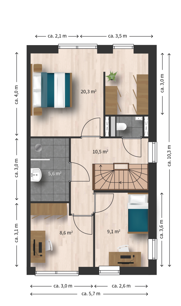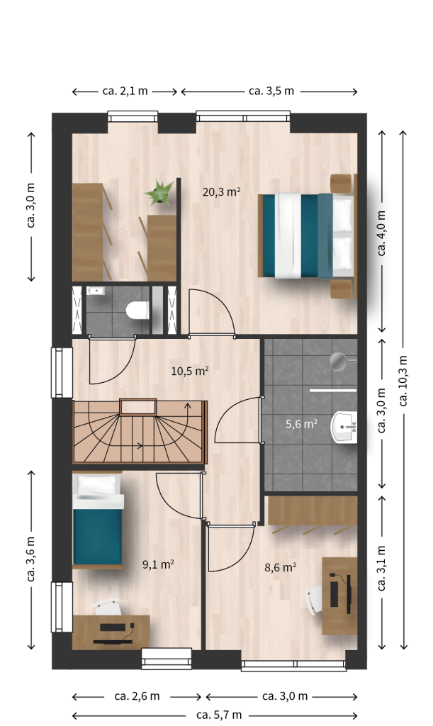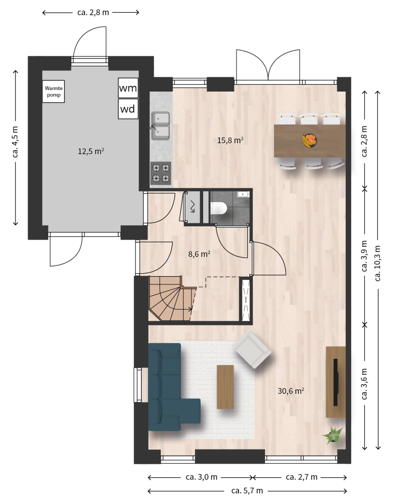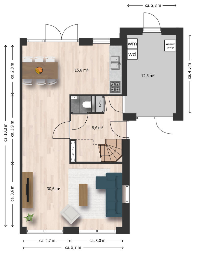 Op de begane grond is een woonkamer met open keuken aan de achterzijde. In de hal bevindt zich een toilet. In de berging op de begane grond bevindt zich de warmtepomp en de opstelplek voor wasmachine en -droger. Op de eerste verdieping zijn drie ruime slaapkamers en een badkamer met douche en toilet. Op de zolderverdieping kan optioneel een vijfde slaapkamer worden gerealiseerd. De woning is onderhoudsarm met kunststof kozijnen.